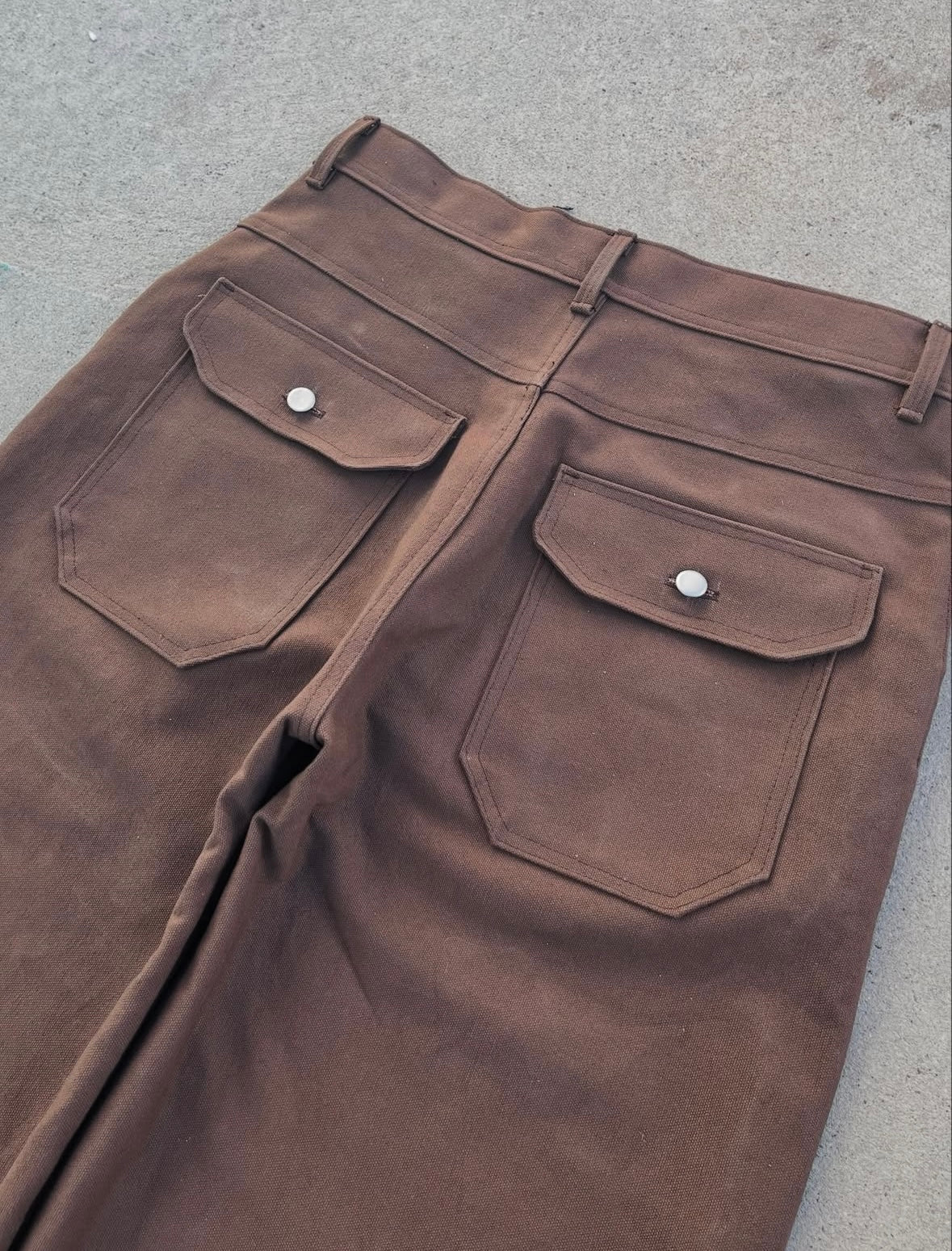 Cut from durable 14oz canvas, this pant delivers a structured wide-straight silhouette with clean, workwear-rooted detailing. The fit sits high on the waist with a full top block and a straight, solid leg that holds its line from hip to hem. The canvas starts off crisp and firm, softening gradually as it develops creases, depth, and a lived-in patina unique to heavy twill.
