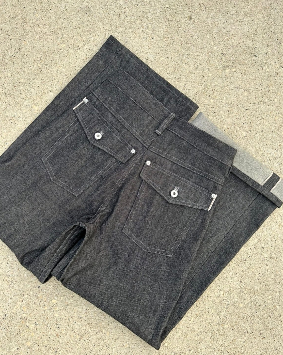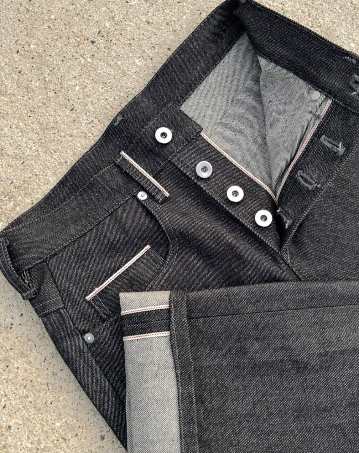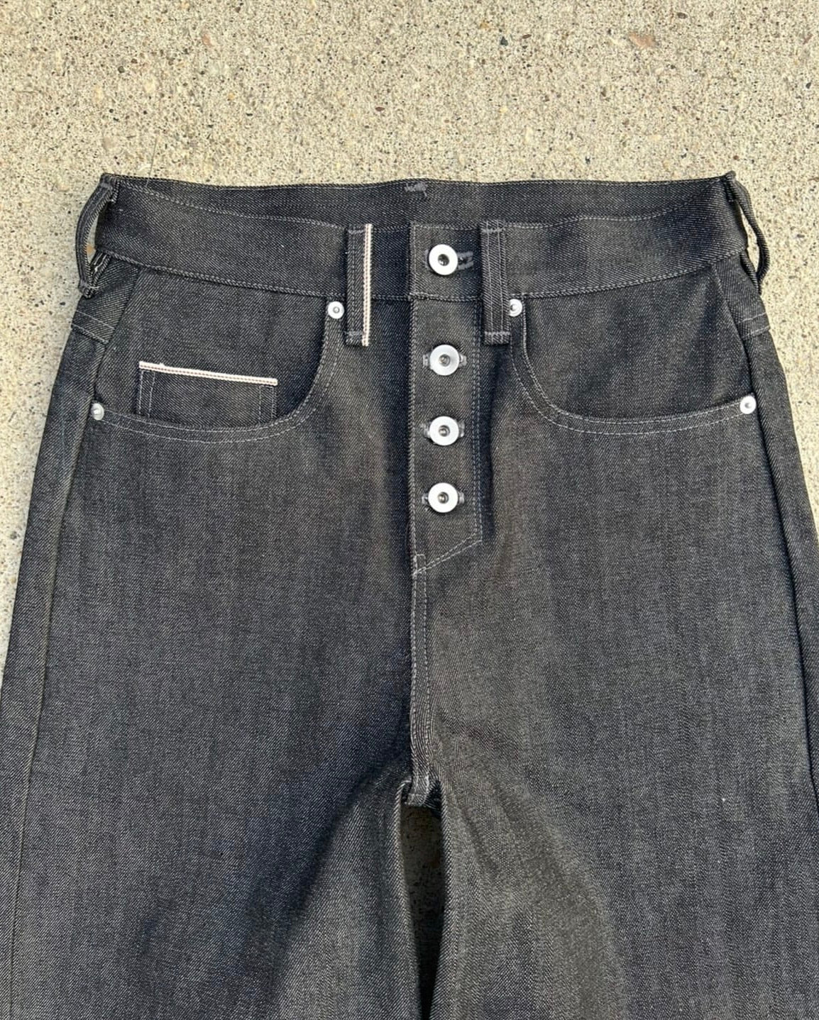 Built from hefty 15oz faded black selvedge denim, this pant combines a vintage workwear attitude with a clean, modern wide-leg silhouette. The fit is high-rise with a full top block and a straight, generous leg that maintains its width from hip to hem, producing a solid, weighty drape. The faded black tone carries a textured, slightly worn-in surface that will continue to evolve with creasing and long-term use.