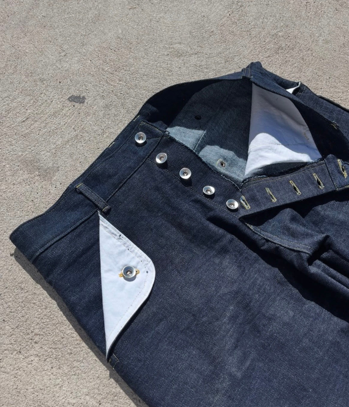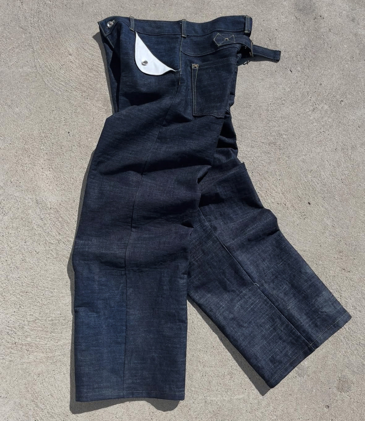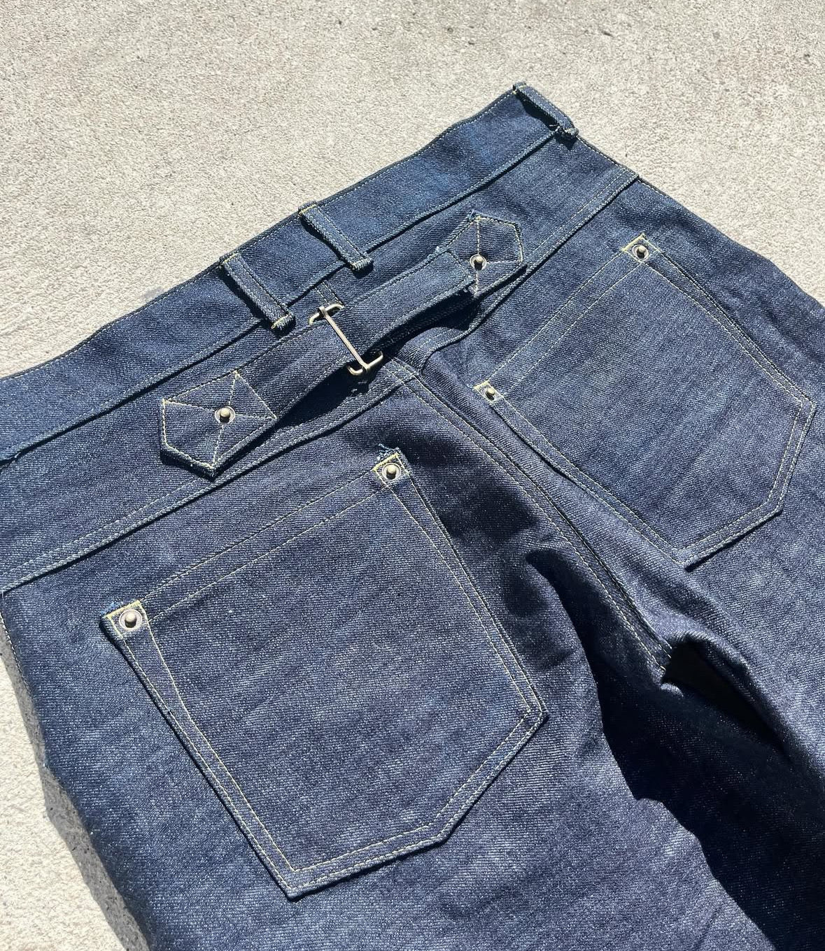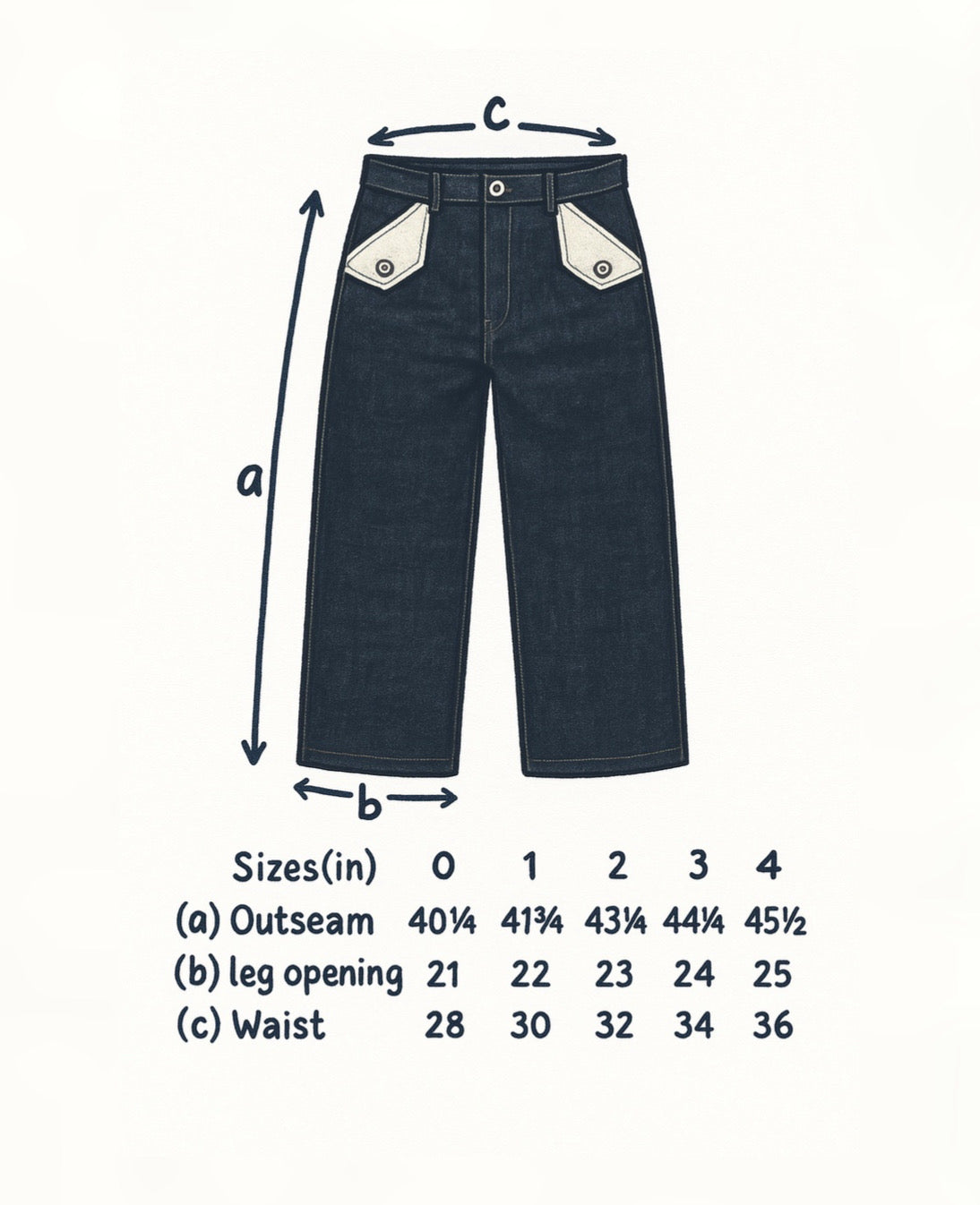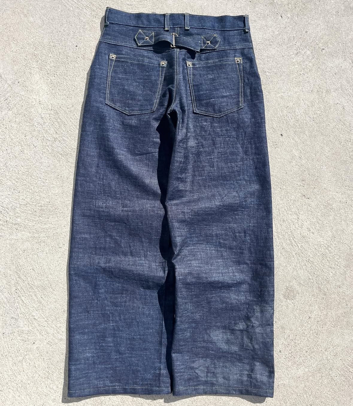 Cut from heavyweight 16oz selvedge denim, this pant delivers a firm, structured wide-straight silhouette built for long-term wear. The fit sits high on the waist with a full top block and a straight leg that keeps its width from hip to hem, giving the denim a clean, architectural fall. The 16oz fabric is dense and rigid at first wear, breaking in slowly to form deep creases, textured grain, and bold, high-contrast fades.